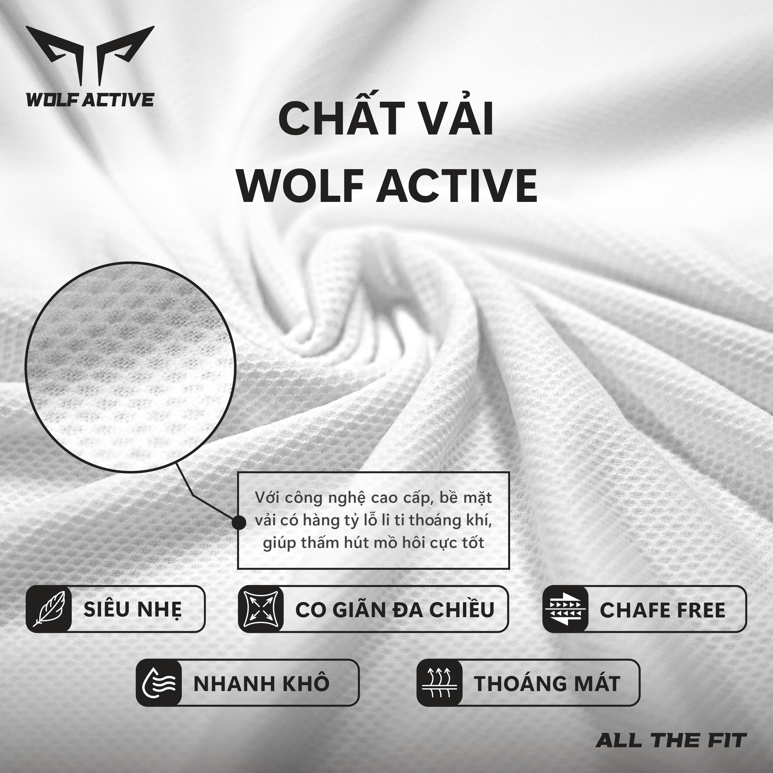 3. (Chất Vải Wolf Active cao cấp thuộc dòng WolfLight siêu nhẹ và mềm mịn, với 90% polyester, 10% Spandex hàng đặt dệt riêng chính phẩm, vải co giãn 4 chiều mềm mịn, thoáng mát và thấm hút, thoát mồ hôi tốt.)